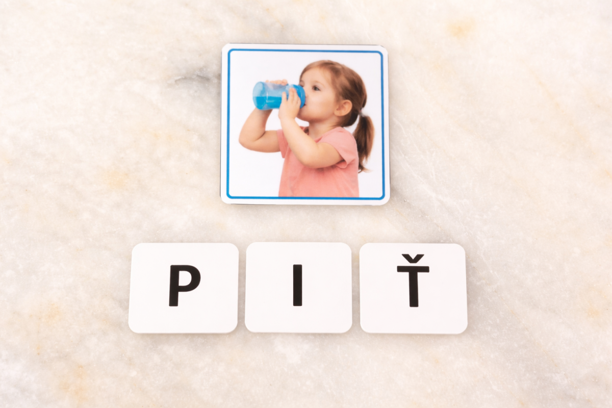 Sada obsahuje obrázkové kartičky (podstatné mená a slovesá) a písmenkové kartičky so slovenskou abecedou, ktoré deťom pomáhajú prirodzene spoznávať slová, ich význam a skladanie.